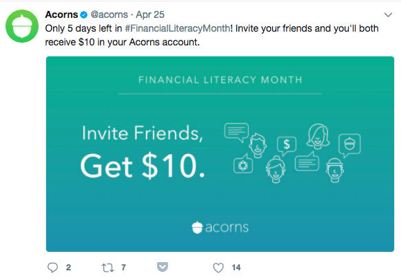 For users on Twitter, Acorns regularly offers referral opportunities to followers. To celebrate Financial Literacy Month, they offered a new incentive. Users who invited friends could get $10 in their account. This was up from the usual $5.