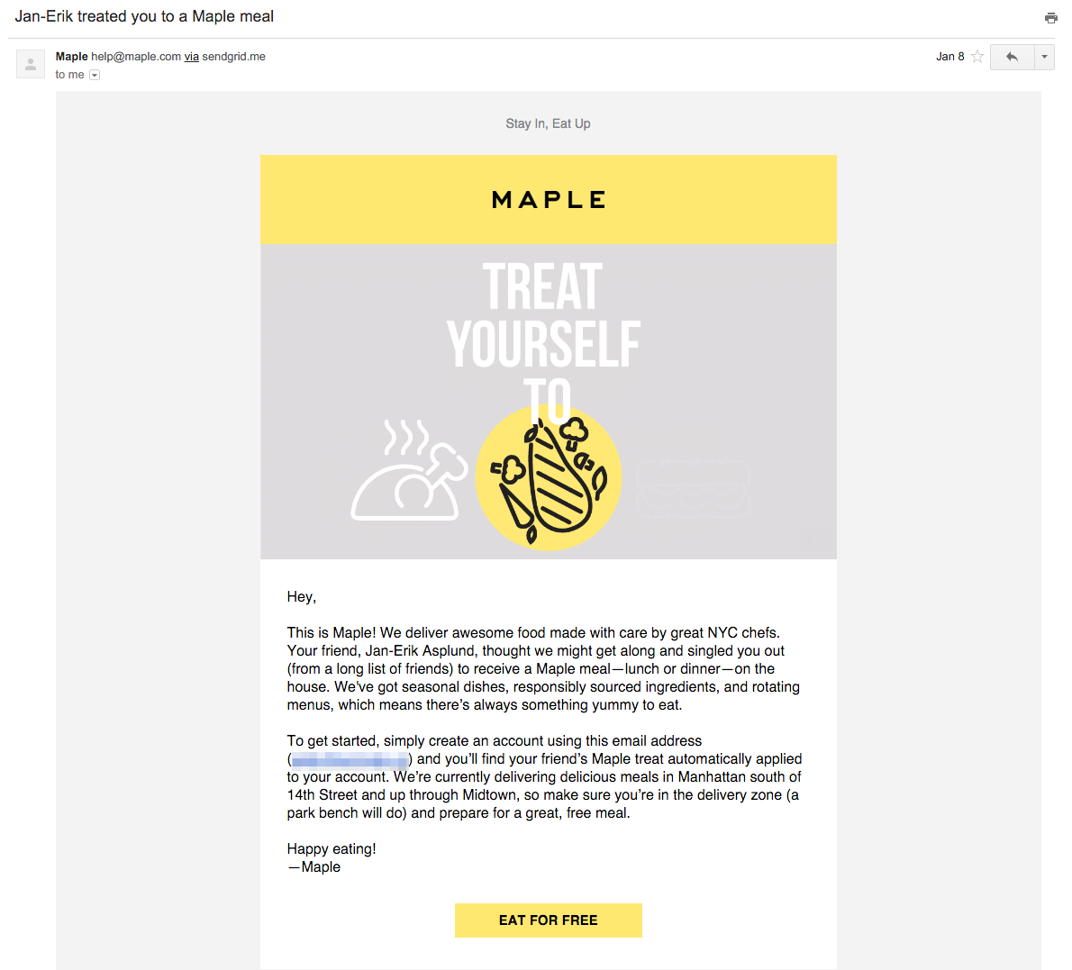 Backed by around $26 million in venture funding, Maple’s betting on expansion—it’s goal is to deliver 100,000 meals per day in New York City. Like Uber, Maple’s referral program is trying to take advantage of the huge upside of the network effect. The more customers it acquires, the more it can expand operations, sending deliveries to larger and larger areas of New York City.