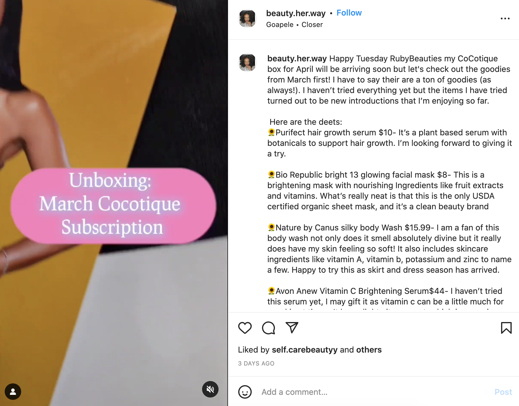 Why it works: Cocotique’s program helps promote brand awareness by encouraging influencers and content creators to promote the beauty box on their own channels. It also does a fantastic job of increasing the visibility of beauty brands run by and for women of color.