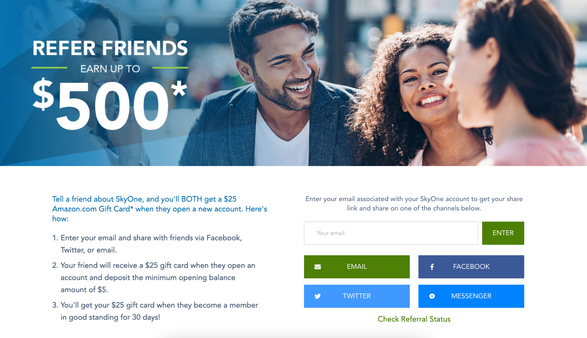 When a new customer uses a referral link to open a new account, they earn a $25 Amazon gift card. If their account remains in good standing after 30 days, the referring customer also earns a $25 Amazon gift card – up to $500 per calendar year. |