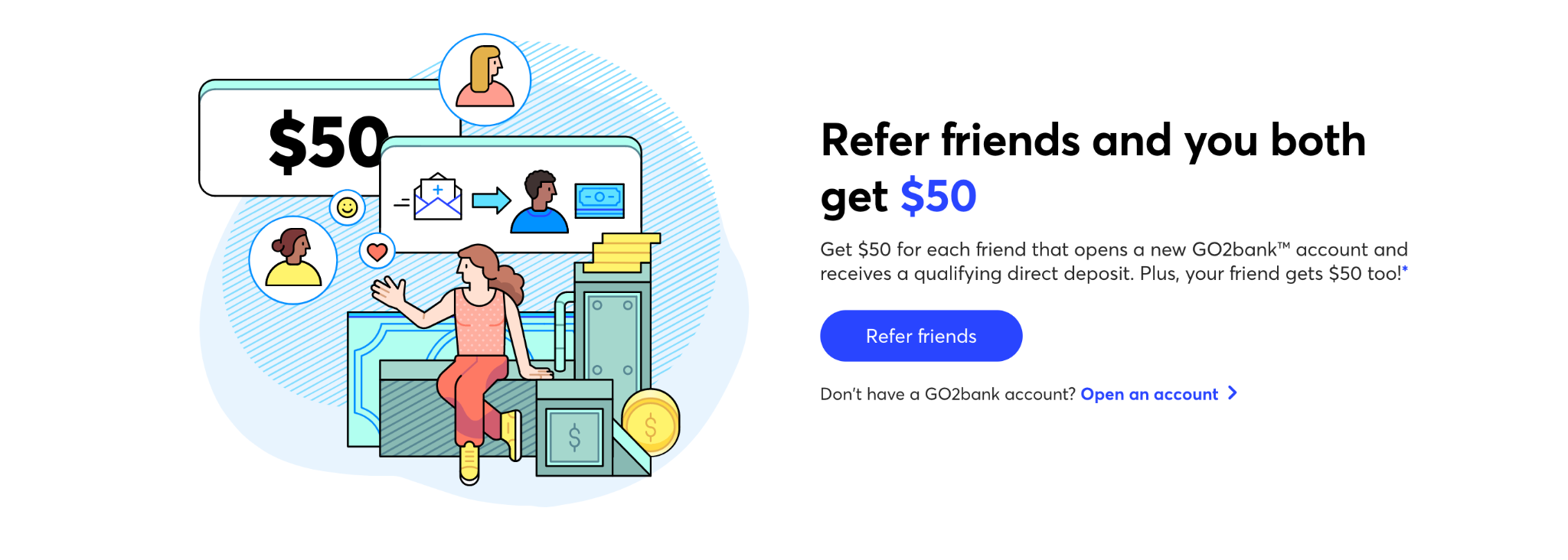 Customers earn $50 for each friend who opens a new bank account with direct deposit. Once the direct deposit is successful, that friend also receives $50. The referring customer can make up to $1,500 per calendar year. |