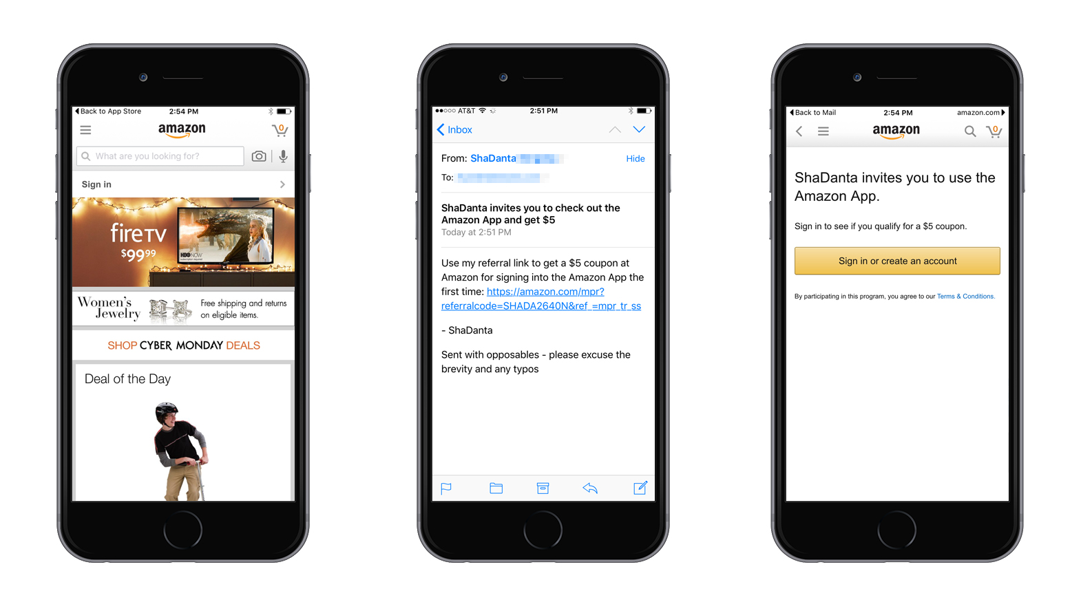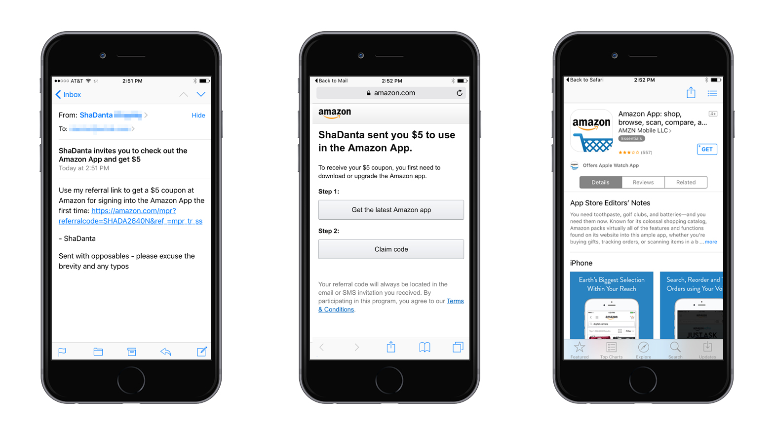 Step 1 took me through the app store to download the Amazon Shopping app. Simple enough. But once I was inside the app, there was no alert or notice of my referral reward. I had to head back to my original share email to find it. Click the images below to take a closer look.