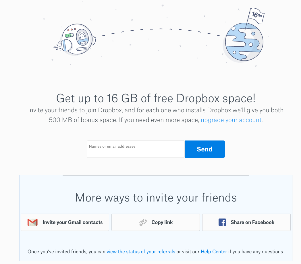 We’re ten years out from Dropbox’s original referral program, and it’s still going strong. With clear visuals and email reminders, it’s more satisfying than ever to refer a newbie to Dropbox.
