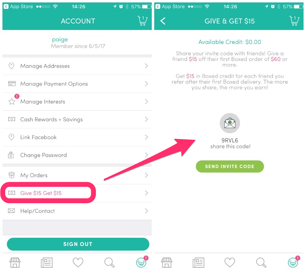 On the Boxed Facebook page, they offer followers the chance to take part in the referral program. Once followers click on a link and sign up, they’re given the option to immediately share the savings with friends. Their email campaign is similar. Every email they send has a reminder to refer a friend at the bottom. When subscribers click on it, they’re given a personal invite code to send to friends.