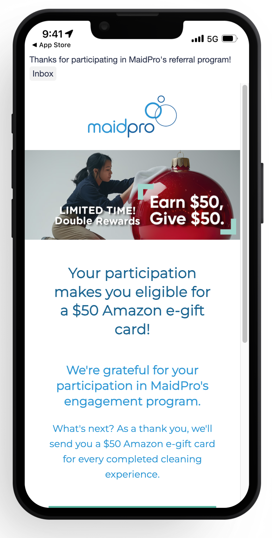 House cleaning service MaidPro gave customers a sweet deal for the winter holidays by increasing their referral incentive for a limited-time only.
