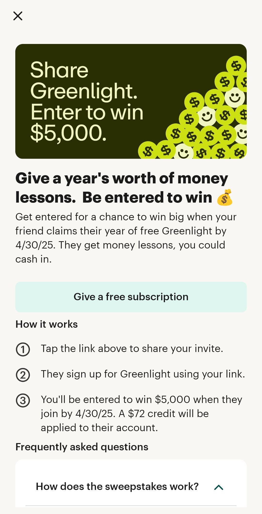 Greenlight has made a splash as a debit card and money management tool for kids and families. The fintech innovator’s referral program branding leans into its younger demographic with playful imagery and a gamified rewards system that gives users a chance to win a major prize by referring their friends. Limited-time offers like this one keep Greenlight’s referral program fresh so its young customers stay excited to open the app and see what’s new.