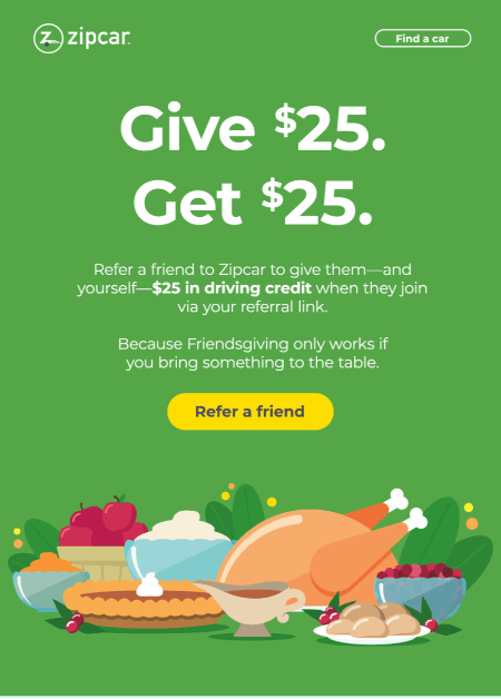 If you want to stand out from the crowd, lean into a holiday that gets overlooked by most brands amidst the chaos of BFCM: Thanksgiving! Zipcar gave its customers something to be truly thankful for with a special referral reward perfect for sharing with friends over turkey and cranberry sauce. The timing of the promo–on the busiest travel weekend of the year–makes the $25 driving credit extra impactful.